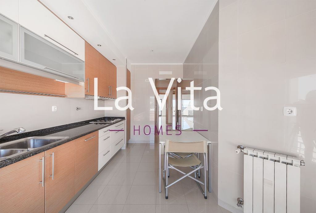 Composto por hall de entrada, sala ampla, varanda com vista desafogada, cozinha totalmente equipada, 3 quartos (uma suite) com roupeiros embutidos, parqueamento para 2 carros e arrecadação.